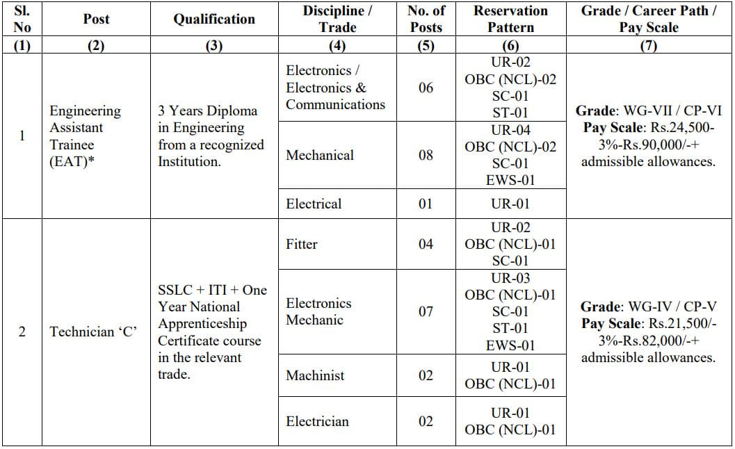 - Technician ‘C’: Candidates should have completed SSLC+ITI in the relevant trade from a recognized institution and one-year apprenticeship training with a National Apprenticeship Certificate in the relevant trade or SSLC + 3 years National Apprenticeship Certificate Course in the relevant Trade.