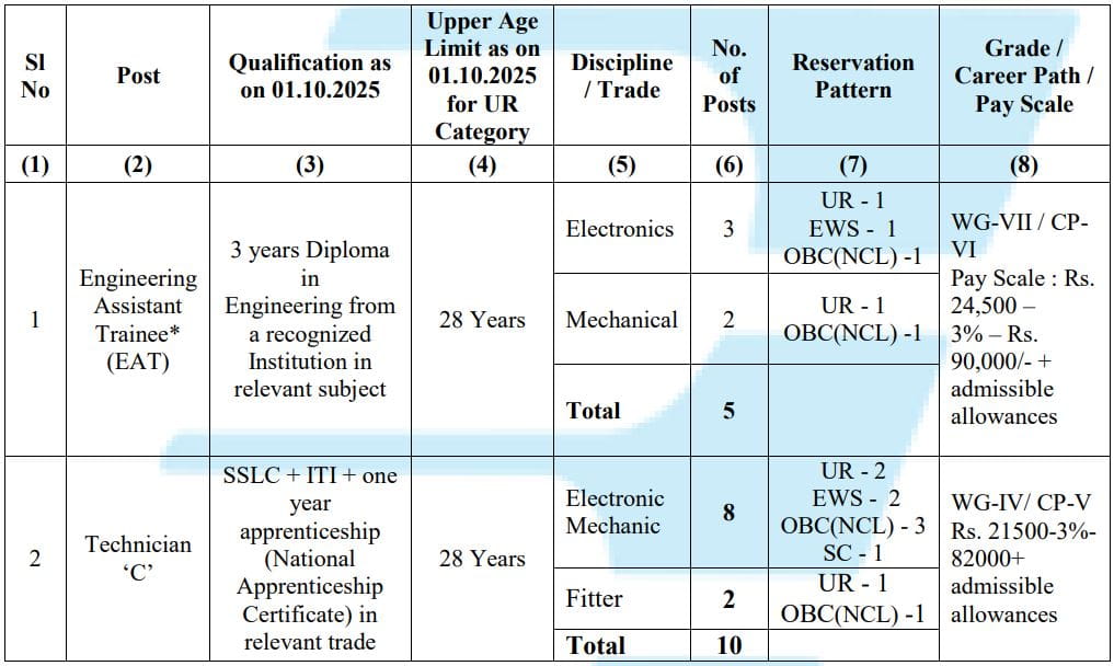 - Technician ‘C’: Candidates should have completed SSLC+ITI in the relevant trade from a recognized institution and one-year apprenticeship training with a National Apprenticeship Certificate in the relevant trade or SSLC + 3 years National Apprenticeship Certificate Course in the relevant Trade.
