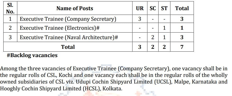 Below are the Cochin Shipyard Limited (CSL) recruitment details.