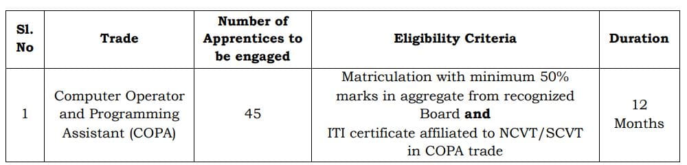- Computer Operator and Programming Assistant (COPA): Matriculation with a minimum of 50% marks in aggregate from a recognized Board and an ITI certificate affiliated to NCVT/SCVT in the COPA trade.